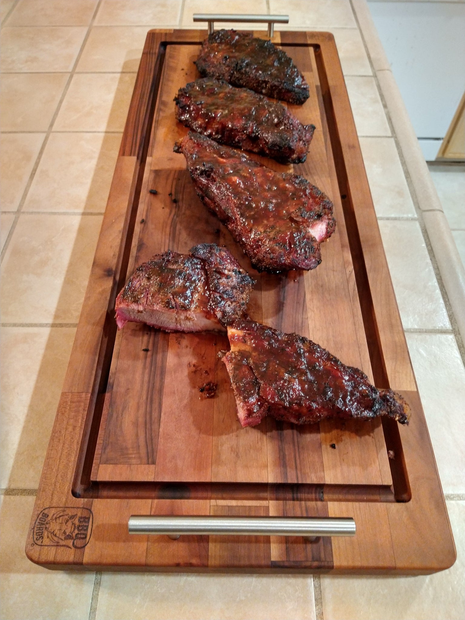 The Brisket BBQ Board® was designed for those in need of an extra large cutting board big enough for a brisket, a couple racks of ribs or a few whole chickens with the utility of a serving tray in one package!