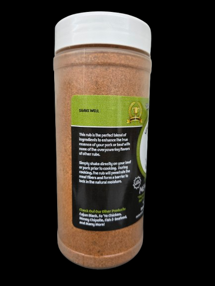 This rub is the perfect blend of ingredients to enhance the true essence of any meat with none of the overpowering flavors and sodium of other rubs. Simply shake directly on your the meat prior to cooking and allow it to sweat out. During this time, the proprietary blend of spices and seasonings will penetrate the meat fibers and form a barrier to lock in the meat's natural moisture and flavor.