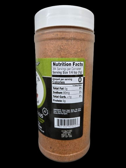 Our Beef & Pork Rub is now Meatlicious! With its upgraded ingredients, it has been proven in competitions to simply be the best meat rub out there and is now in a larger size (14 oz) shaker bottle per the request of cooks everywhere. With it's unique and complex flavors, you are sure to please any judge, friend or family member. At only a 3% (80mg) sodium content, it will also put a smile on your face.